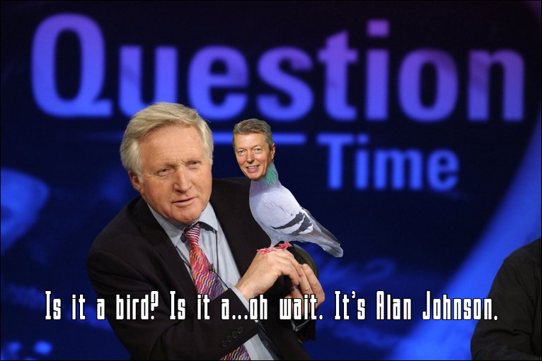 I don’t know if it’s just us, but my better half and I have always been aware of something very pigeon-like when it comes to Alan Johnson. Maybe it’s the beady eyes, the raft of grey suits or the way his head wobbles about when he speaks but there’s something there that leads us to believe that he actually lives in a nest atop Nelson’s Column and and survives on a mostly crumb based diet (see Fig. 1). That aside, I’ve got a big soft spot for Johnson, largely down to the fact that he seems very human (well, human/pigeon, like if The Fly starred a dumpy David Bowie impersonator and it was a dove that had got into the teleporter) and he doesn’t entirely fit in with the rest of New Labour. He’s also one of Question Time’s most proficient defensive players and has a gift for sounding sincere when breaking bad news, a rare trait in an age when hard-truths usually end up spun into an sprawling mass of bullshit. Take tonight’s first question, which was about whether the rash of business leaders who came out for Cameron’s NI cut had “sealed the deal” for Cameron. This would present a problem for most New Labour meat puppets who are usually afraid of offending anyone (hence their love of triangulation) and especially the Holy Cows of Enterprise. Not Johnson though, who was pretty blunt about the fact that of course business wouldn’t like this, but tough shit. The money’s got to come from somewhere and at least we have a plan as to where that is (unlike the Tory’s). That’s actually surprisingly refreshing, watching a Labour front bencher basically telling the high and mighty of commerce to go and get bent. Of course, it didn’t entirely go his way and he was harried by both Clarke and the audience for effectively taxing the recovery, but he didn’t yield on this one and managed to land some fairly heavy blows on the Tories for their lack of coherence on the economy.. Nice work. Question 2 was pretty straight forward (did St Vincent of Cable win the Chancellors debate?) as Darling had acquitted himself well that night, but I was a little disappointed to see him resist the urge to stick the knife into George Osborne. I know that a lot of Johnson’s strength lies in his coming across as genuinely nice guy, but it has to be tempered with at least a little killer instinct and to miss an opportunity to really hammer the weakest link in the Tory chain is frankly a little limp. However, he did win back a few points when an audience member got all hard left about things and he countered with a list of Labours achievements (a recurring tactic throughout the night). That got him his first smattering of applause on an evening where Labour should have been entirely on the backfoot so kudos on that one Pigeonface. The next question (is the re-emergence of Blair a help or hindrance to Labour?) had the potential to go horribly sideways, but he managed to defuse the situation with a canny little flurry of nudge-nudge-wink-wink (an unspoken ‘you guys know what I’m thinking but you also know I’ll be in a whole heap of trouble if it slips out’), before flipping the whole issue 180 degrees and laying into Cameron’s ‘heir to Blair’ routine. The brief outburst from Littlejohn that followed was swiftly suppressed by again going through the list of Labour achievements (which again got applause) and he emerged unscathed from what could have been a sticky wicket. The outcome of Question 4 (is Brown a big fat liar?) was less certain and Johnson wisely decided to keep a low profile, venturing out only to defend the immigration statistics as ‘an honest mistake’ before reminding everyone that Chris Grayling has dabbled in similar roguery on the knife crime stats. To the extent that he himself came out relatively unscathed, it was a good move and by the end of it, it was Littlejohn who looked to be the biggest twat. The last question (does Lumley deserve an apology from Kevin Jones?) was a no-win situation for him (as is pretty much any situation involving a scorned Lumley), but he did his best to switch the heat over to the Tories for not having done anything about the Gurkha s on their watch. It wasn’t entirely successful, but yet again, any anger that emerged appeared to be directed at Labour rather than at Johnson himself. And that was pretty much it from him.