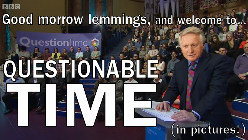 Good morrow lemmings and welcome to Questionable Time, lackadaisical from Leeds! Not much else to say other than we’ll shortly be forming a coalition with Scottish Questionable Time. Look forward to our posts detailing the beauty of Glasgow. After all, they’ll be conveniently bite-sized!