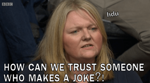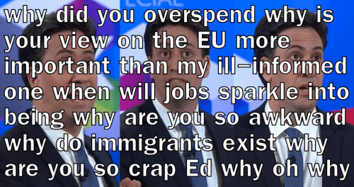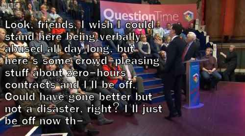 Then a very rude man in a tosser-like suit attacks Natalie and the Greens for being DIRTY HIPPIES. He probably owns a fedora and posts libertarian memes on 4chan. See, ma, I can stereotype too! Meanwhile, according to other equally snitty members of the audience, it sounds like England and Scotland are on the brink of war. I don’t like where this is going. Let’s move on, to…