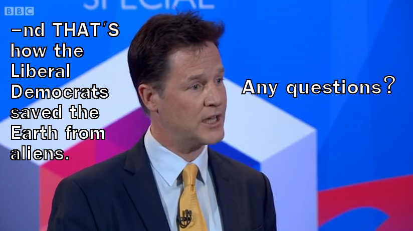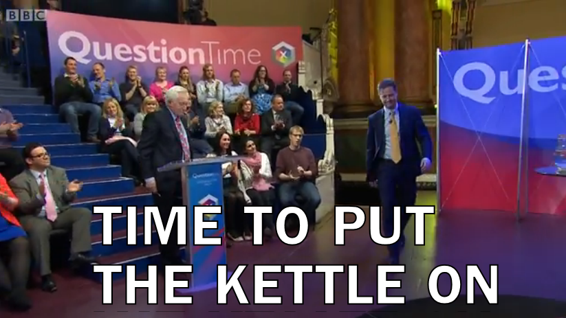 “Natalie Bennett, are you a petrolhead?” asks Dimbleby. This was a great use of our time. The most important information to arise, though, was Ian Hislop’s frankly alarming revelation that Clarkson drew blood by hitting him with a pen the last time he was on Question Time and Charles Kennedy was there to confirm it. This means that, yes, Jeremy Clarkson may be a vampire. I didn’t expect it at first but in retrospect everything now makes sense.