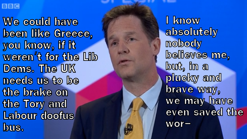 (Meanwhile, holy shit, Charles Kennedy looks tired. Are you okay, Charlie? He must be worried about losing his seat. Poor thing. He’s like an endangered and lovable tapir.)
